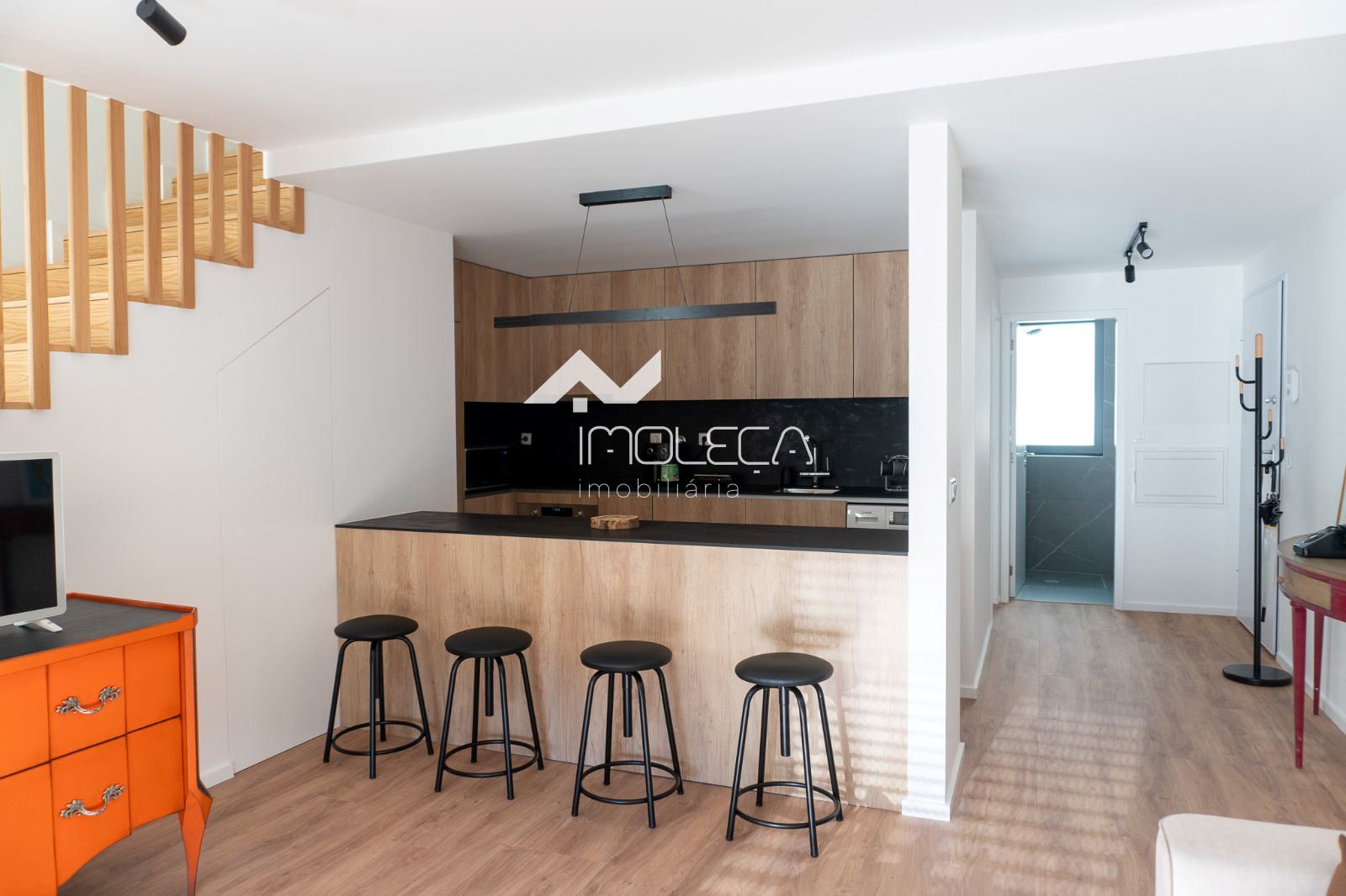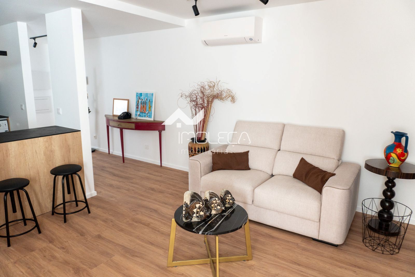 Organizado em hall de entrada, sala e cozinha em modo open space, quarto de banho de serviço e +1 que tanto pode ser escritório como quarto, conforme se encontra presentemente como possível visualizar nas fotos.