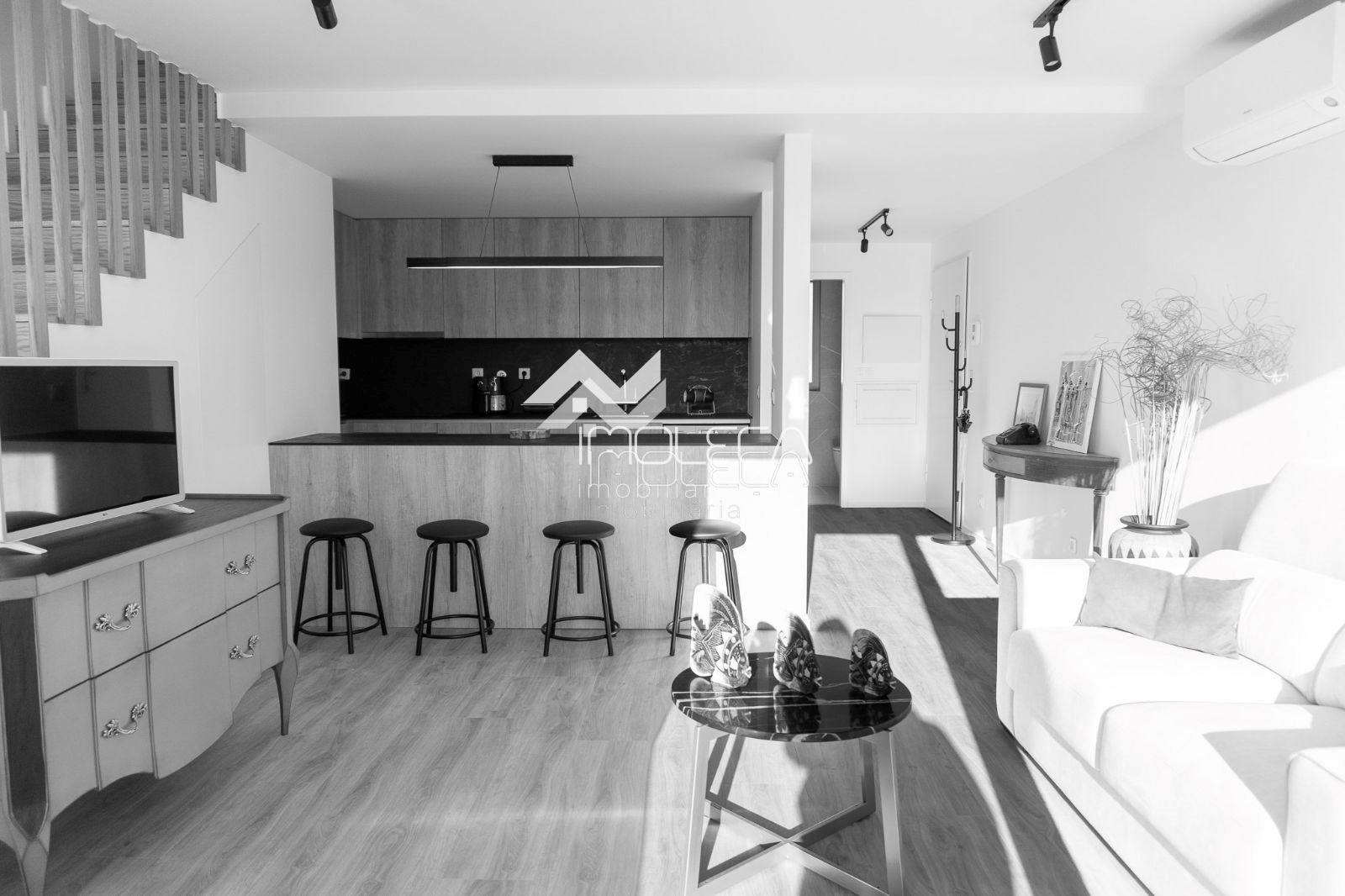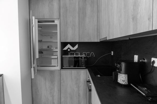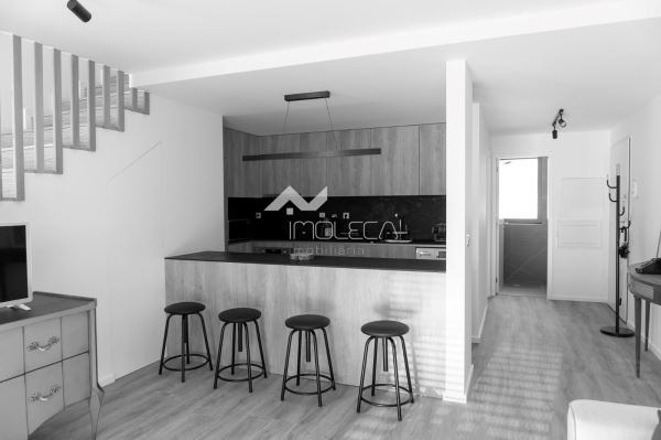 Organizado em hall de entrada, sala e cozinha em modo open space, quarto de banho de serviço e +1 que tanto pode ser escritório como quarto, conforme se encontra presentemente como possível visualizar nas fotos.