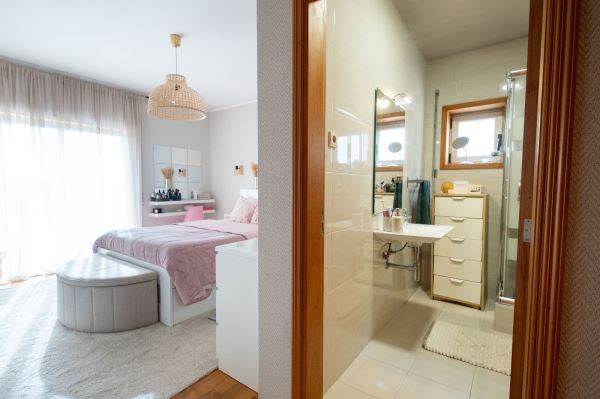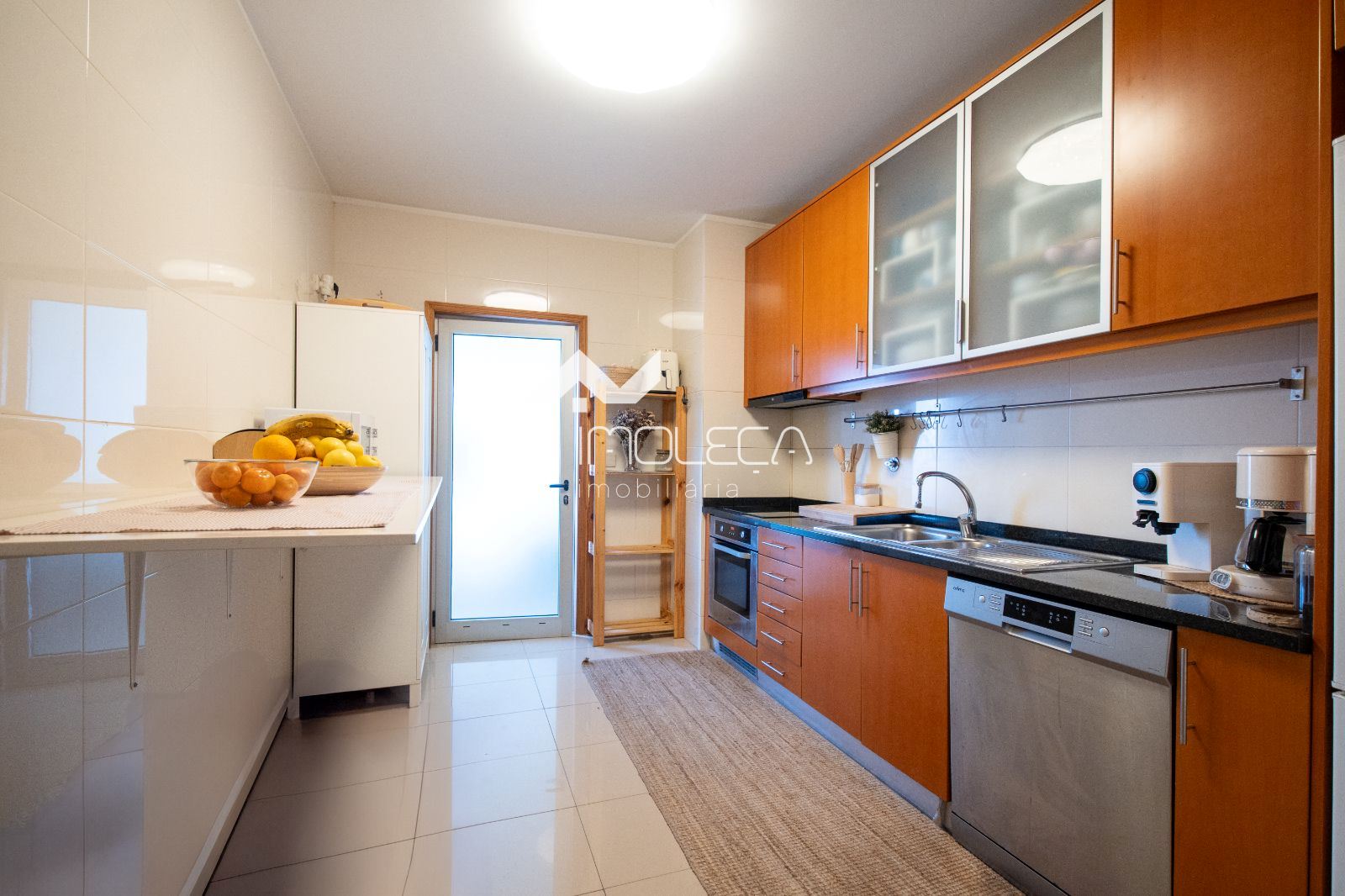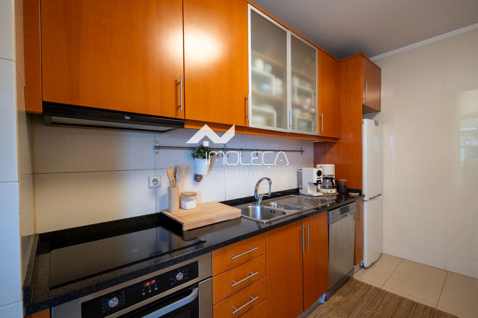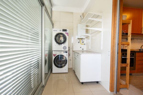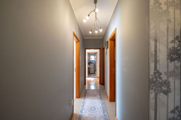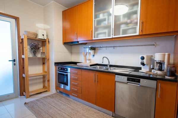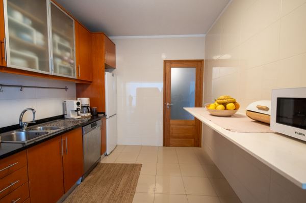 A cozinha é funcional e bem equipada, com bastante arrumação e zona de refeições. Os três quartos têm boas áreas, incluindo uma suíte, todos com roupeiros embutidos.